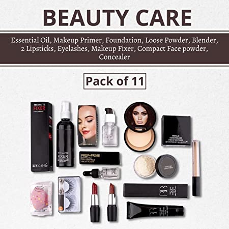 AP Home Decor Makeup kit combo pack of 11, Essential Oil, Face Primer, foundation, Concealer, Loose Powder, Blender, Makeup Fixer, Compact Powder face powder, 2 lipstick, eyelashes,