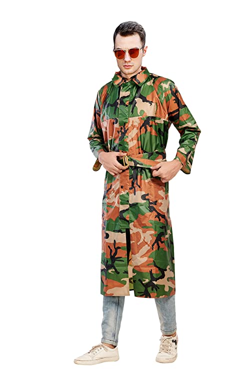 Aristocrat Rainwear Mens Army Print Long Raincoat Waterproof with Collar Adjustable Hood and Full Sleeve Stylish Full Workwear Barsati Rain Suit with Pockets and Belt