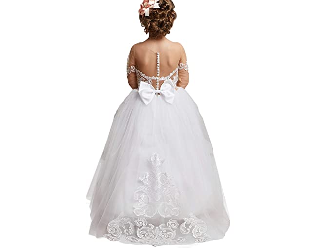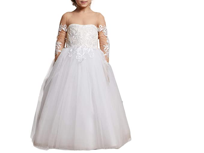 [Fashion design]:A-line,floor length,long sleeve ,scoop neck,the top of the dress is lace,was decorated with appliques,matched with puffy skirt,your girl will love it.