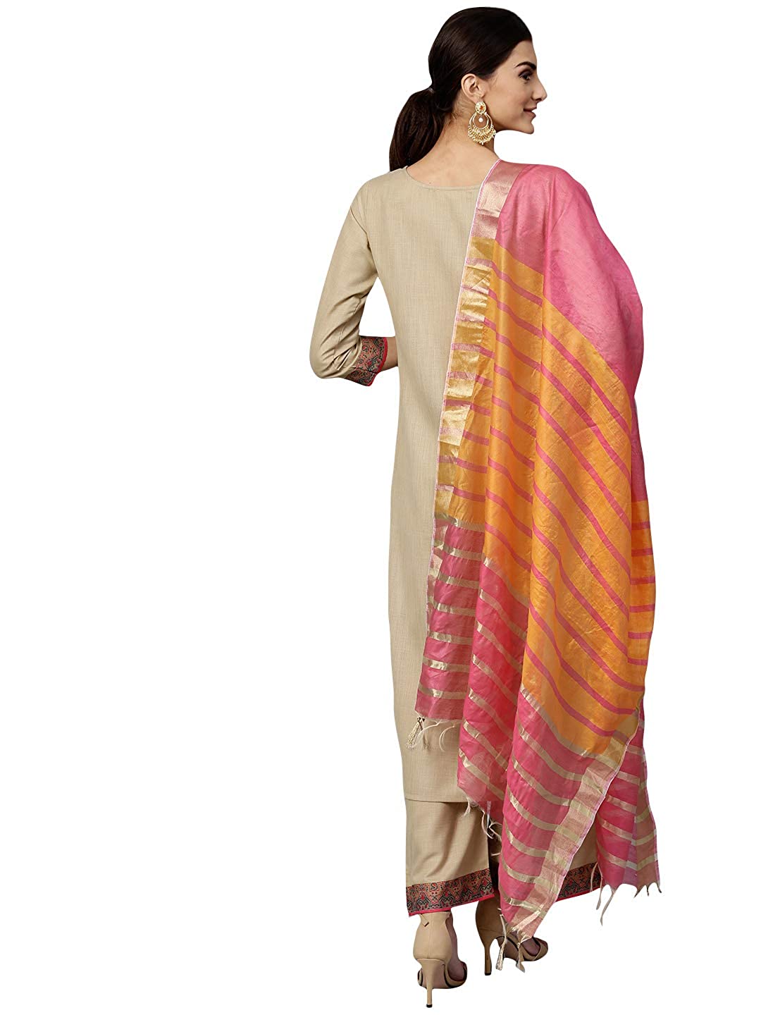 Color : Beige || Fabric : - Top : Pure Cotton, Bottom : Pure Cotton, Dupatta : Art Silk