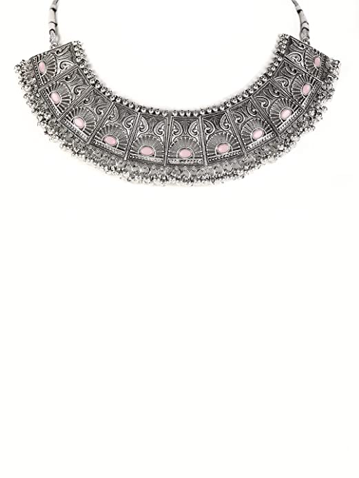 Jazz And Sizzle Pink Stones Studded Oxidised Silver Plated Necklace Set With Earrings for Girls and Women- Set of 1