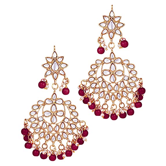 Peora Kundan Pearl Maroon Layered Long Jewellery Necklace Set with Earring Maang Tikka Earrings for Women