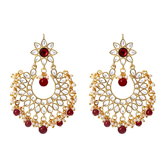 Peora Kundan Pearl Maroon Layered Long Jewellery Necklace Set with Earring Maang Tikka Earrings for Women