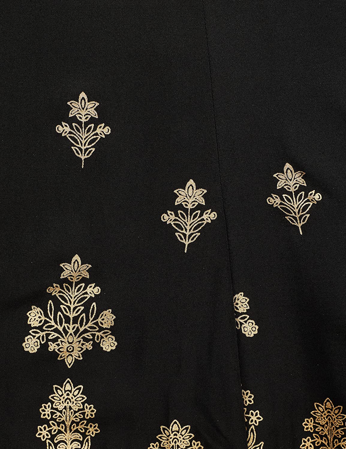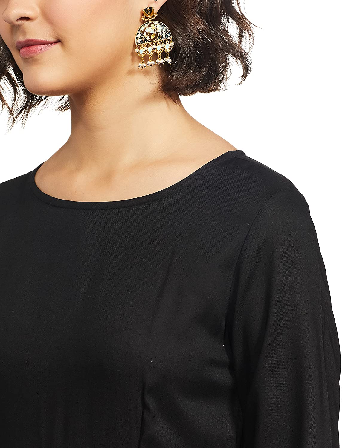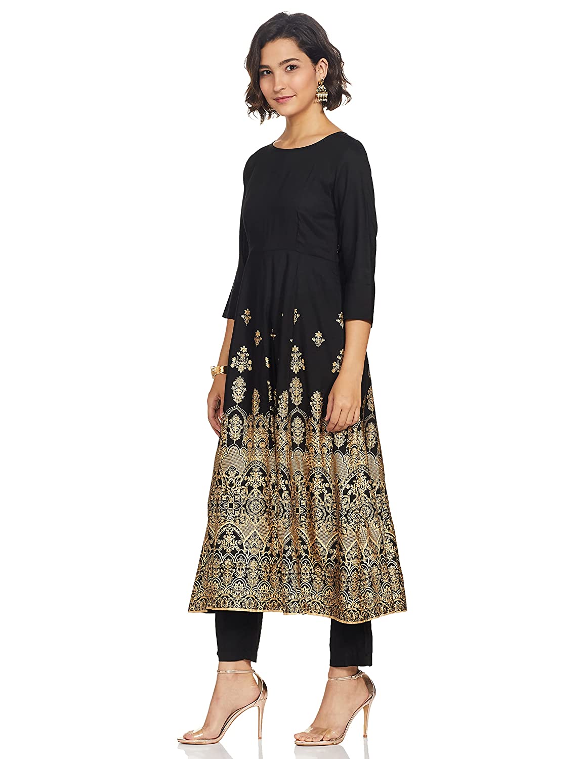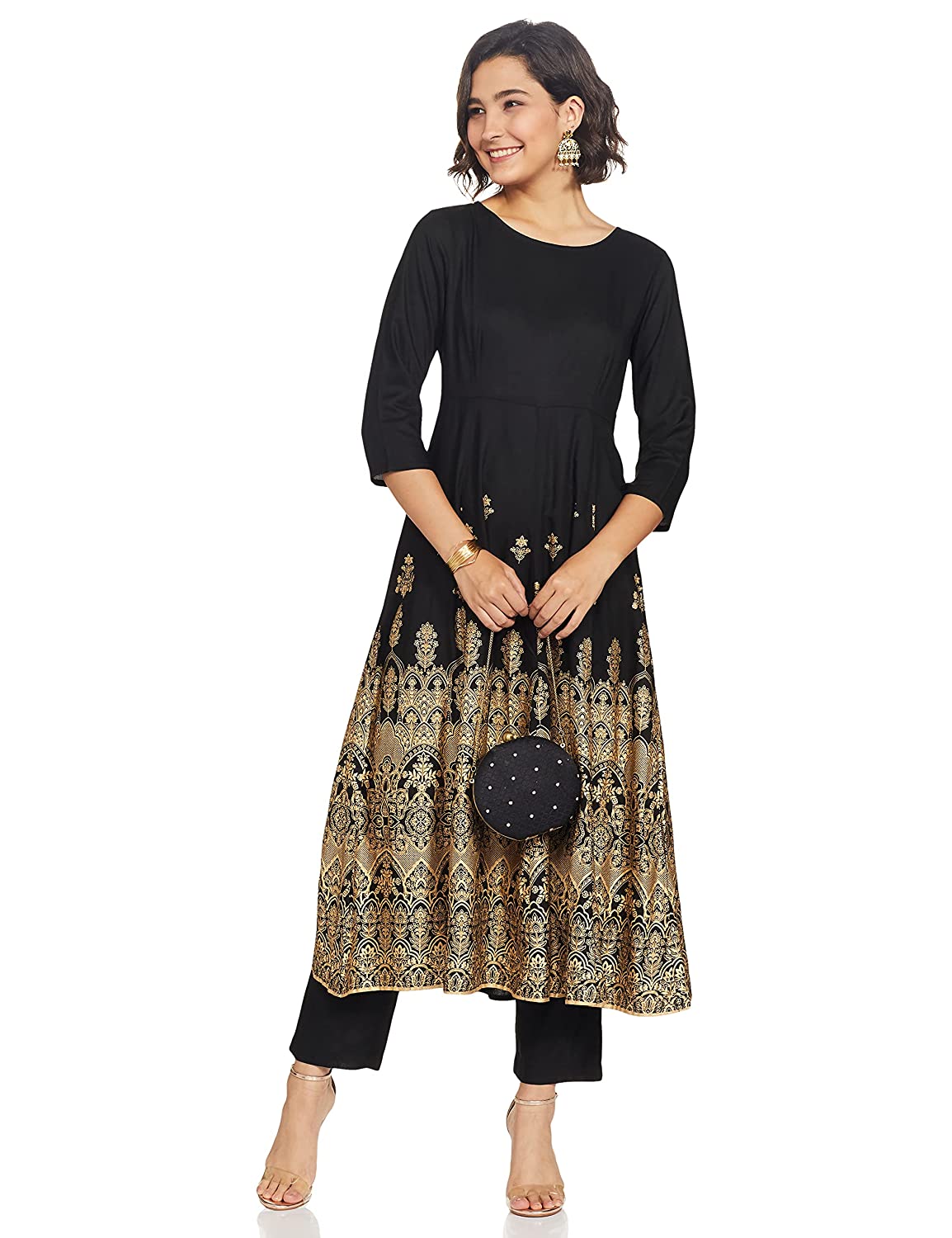 Printed round neck kurta with three quarter sleeve and border detail Solid cigarette pants